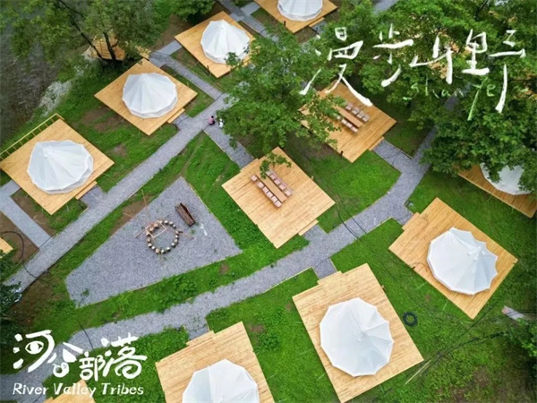 犀牛寨河谷部落露營基地周圍綠意盎然,空氣清新,景色宜人,營地坐落在峽谷茂林之中,有清河碧波順流而過,為游客提供了一個清幽、寧靜的露營環境。
