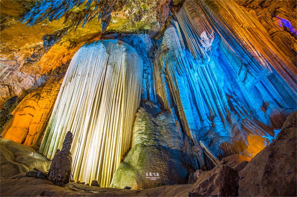 “地下藝術宮殿”芙蓉洞,巨幕飛瀑、犬牙晶花,奇幻無窮。五彩的燈光,奇特的鐘乳石,形態各異,一步步深入,仿佛走進童話世界。
