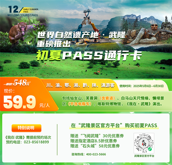 59.9元=仙女山+芙蓉洞(含索道)+白馬山天尺情緣+懶壩(不含電瓶車)+《我在武隆》演出+喀斯特博物館+三重驚喜優(yōu)惠!人均一杯咖啡錢,承包你的初夏快樂!2025年5月6日—6月30日,轉(zhuǎn)發(fā)武隆旅游Pass卡相關(guān)信息到朋友圈,薅羊毛薅到手軟!