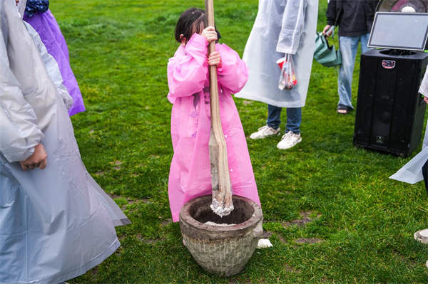 “咚!咚!”石臼邊圍滿躍躍欲試的游客,木槌起落間糯米的清香彌漫開來。親手捶打、揉捏,再趁熱捏成軟糯的糍粑團,蘸上紅糖黃豆粉當場品嘗,“自己打的糍粑就是香!”一位小朋友舉著糍粑笑得滿臉黏甜。這份親手創造的美味,是帶得走的節日祝福,更是看得見的文化傳承。