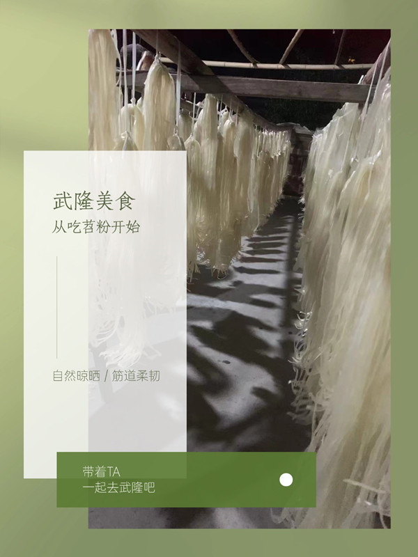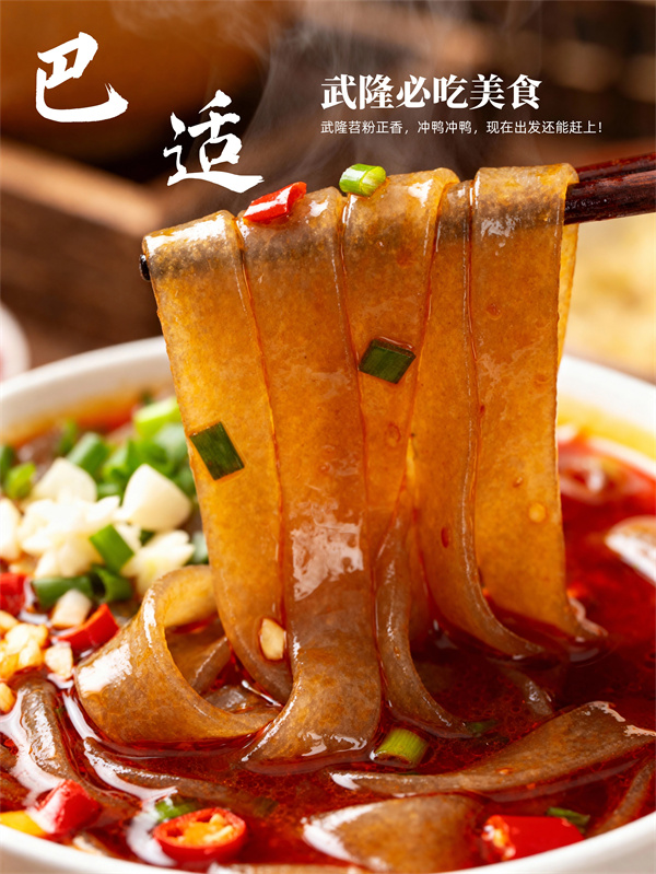 武隆苕粉選用武隆當地優質紅薯為原料,結合傳統工藝與現代技術精心制作而成。每一根苕粉都粗細均勻,晶瑩剔透,散發著自然的紅薯清香。置身于武隆的美景之中,仿佛能感受到那山水靈氣賦予苕粉的獨特韻味。